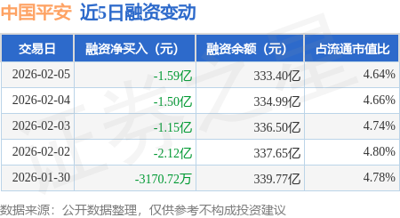 证券之星消息,2月5日,中国平安(601318)融资买入5.65亿元,融资偿还7.25亿元,融资净卖出1.59亿元,融资余额333.4亿元,近20个交易日中有14个交易日出现融资净买入。
