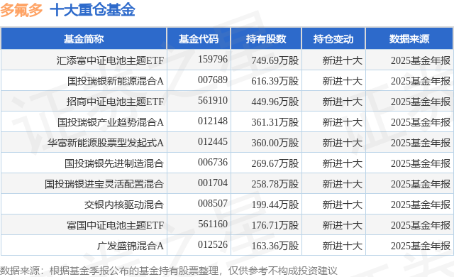 根据2025基金年报公募基金重仓股数据,重仓该股的公募基金共44家,其中持有数量最多的公募基金为汇添富基金的汇添富中证电池主题ETF。汇添富中证电池主题ETF目前规模为93.91亿元,最新净值0.9384(2月5日),较上一交易日下跌2.72%,近一年上涨64.72%。该公募基金现任基金经理为董瑾 罗昊。董瑾在任的基金产品包括:添富沪深300ETF,管理时间为2019年12月4日至今,期间收益率为39.3%;汇添富沪深300指数(LOF)A,管理时间为2019年12月31日至今,期间收益率为41.97%;汇添富中证全指证券公司ETF联接(LOF)A,管理时间为2019年12月31日至今,期间收益率为14.76%;汇添富中证沪港深500ETF,管理时间为2021年2月1日至今,期间收益率为3.73%。罗昊在任的基金产品包括:汇添富国证生物医药ETF,管理时间为2024年9月11日至今,期间收益率为26.93%;汇添富中证信息技术应用创新产业ETF,管理时间为2024年9月11日至今,期间收益率为85.41%;汇添富上证科创板50成份ETF,管理时间为2025年1月20日至今,期间收益率为48.06%;汇添富中证全指软件ETF发起式联接A,管理时间为2025年2月21日至今,期间收益率为-2.02%。