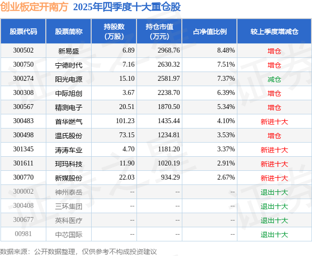 根据2025基金年报公募基金重仓股数据,重仓该股的公募基金共2家,其中持有数量最多的公募基金为南方基金的创业板定开南方。创业板定开南方目前规模为3.5亿元,最新净值1.3897(2月5日),较上一交易日下跌1.28%,近一年上涨52.73%。该公募基金现任基金经理为应帅。应帅在任的基金产品包括:南方稳健成长混合,管理时间为2012年11月23日至今,期间收益率为284.07%;南方稳健成长贰号混合,管理时间为2012年11月23日至今,期间收益率为289.56%;南方驱动混合,管理时间为2016年3月23日至今,期间收益率为278.64%;