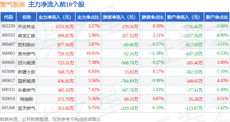 从资金流向上来看,当日燃气板块主力资金净流出1.18亿元,游资资金净流出5200.46万元,散户资金净流入1.7亿元。燃气板块个股资金流向见下表: