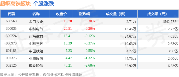 证券之星消息,2月6日超级高铁板块较上一交易日下跌0.89%,银轮股份领跌。当日上证指数报收于4065.58,下跌0.25%。深证成指报收于13906.73,下跌0.33%。超级高铁板块个股涨跌见下表: