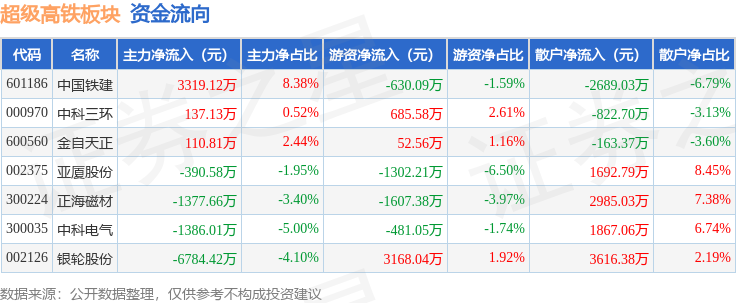 从资金流向上来看,当日超级高铁板块主力资金净流出6371.62万元,游资资金净流出114.53万元,散户资金净流入6486.16万元。超级高铁板块个股资金流向见下表: