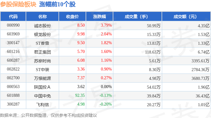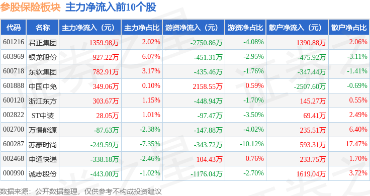 从资金流向上来看,当日参股保险板块主力资金净流出7.3亿元,游资资金净流入2539.58万元,散户资金净流入7.04亿元。参股保险板块个股资金流向见下表: