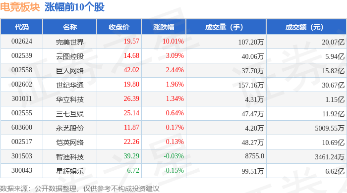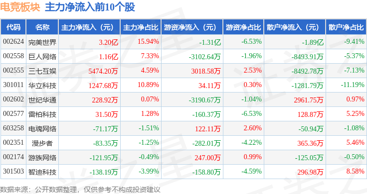 从资金流向上来看,当日电竞板块主力资金净流出6.96亿元,游资资金净流入3357.58万元,散户资金净流入6.62亿元。电竞板块个股资金流向见下表: