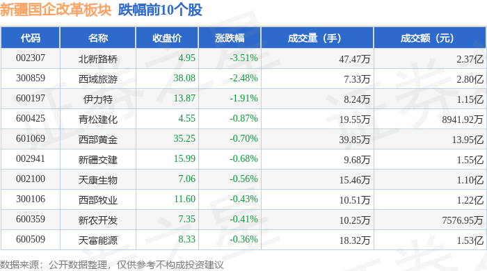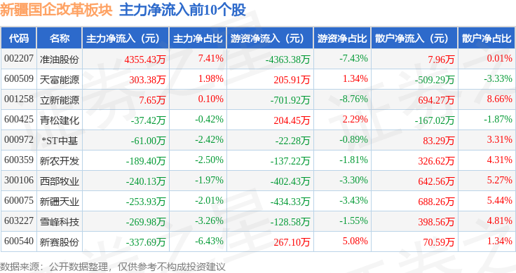 从资金流向上来看,当日新疆国企改革板块主力资金净流出1.54亿元,游资资金净流出1.02亿元,散户资金净流入2.56亿元。新疆国企改革板块个股资金流向见下表: