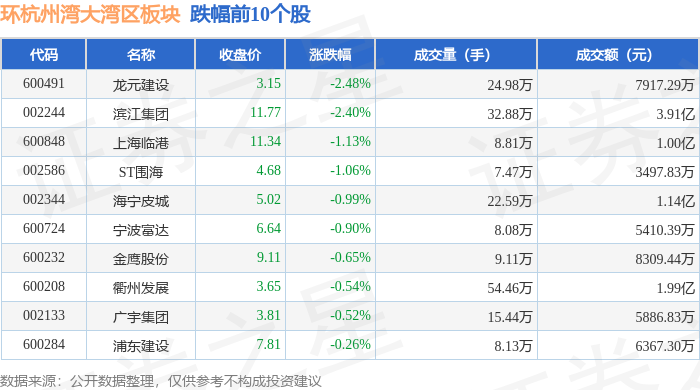 证券之星消息,2月6日环杭州湾大湾区板块较上一交易日下跌0.3%,龙元建设领跌。当日上证指数报收于4065.58,下跌0.25%。深证成指报收于13906.73,下跌0.33%。环杭州湾大湾区板块个股涨跌见下表: