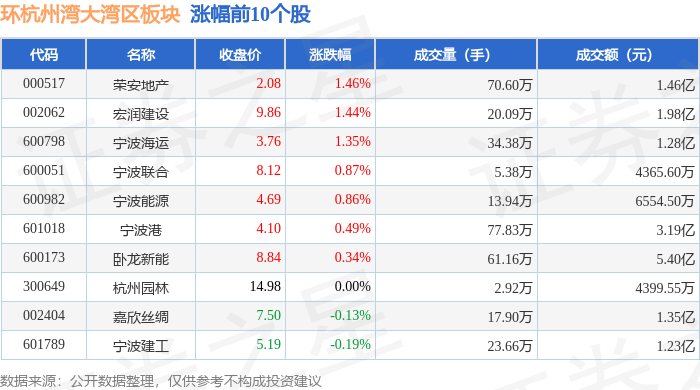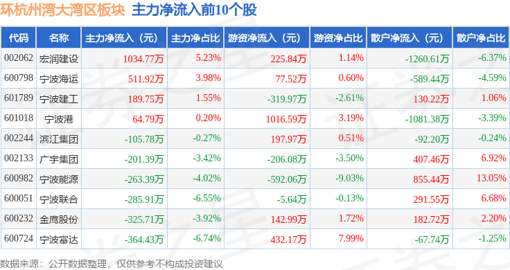 从资金流向上来看,当日环杭州湾大湾区板块主力资金净流出1.18亿元,游资资金净流入2555.24万元,散户资金净流入9266.67万元。环杭州湾大湾区板块个股资金流向见下表: