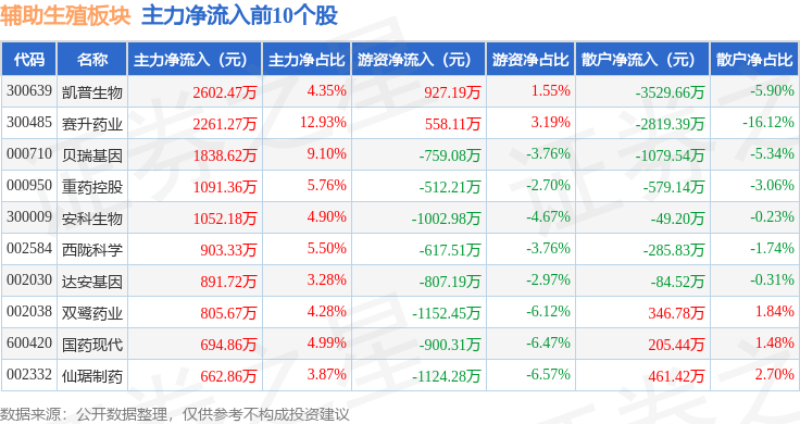 从资金流向上来看,当日辅助生殖板块主力资金净流出1.4亿元,游资资金净流出4652.5万元,散户资金净流入1.86亿元。辅助生殖板块个股资金流向见下表: