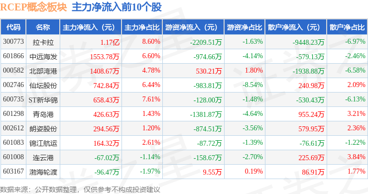 从资金流向上来看,当日RCEP概念板块主力资金净流入1761.15万元,游资资金净流出4857.46万元,散户资金净流入3096.31万元。RCEP概念板块个股资金流向见下表: