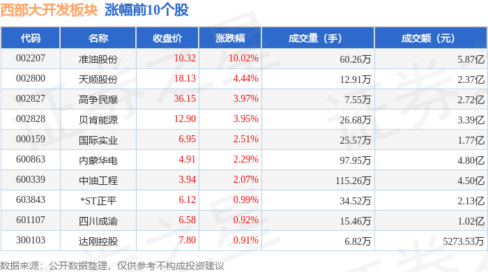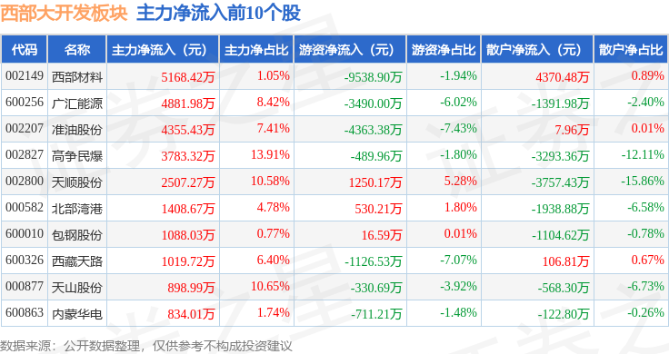 从资金流向上来看,当日西部大开发板块主力资金净流出4.65亿元,游资资金净流出1.03亿元,散户资金净流入5.69亿元。西部大开发板块个股资金流向见下表: