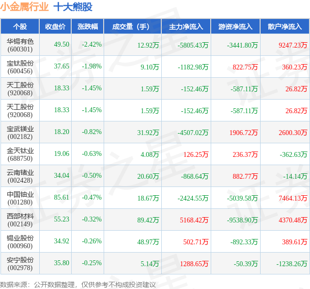 个股表现方面,小金属行业当日领跌股为华锡有色(600301),该股当日报收49.5,下跌2.42%,成交量12.92万,主力资金净流出5805.43万元。宝钛股份(600456)以下跌1.98%紧随其后,该股当日成交量9.1万,主力资金净流出1182.98万元。除此之外,天工股份(920068)、天工股份(920068)、宝武镁业(002182)均进入当日熊股之列。具体个股列表见下表: