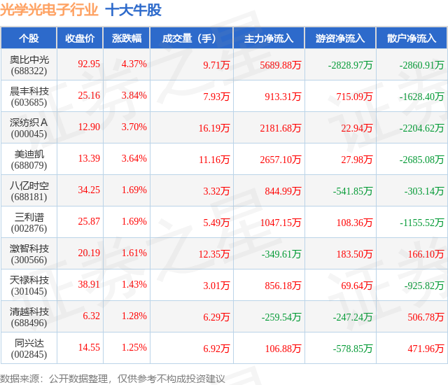 个股表现方面,光学光电子行业当日领涨股为奥比中光(688322),该股当日报收92.95,上涨4.37%,成交量9.71万,主力资金净流入5689.88万元。晨丰科技(603685)以上涨3.84%紧随其后,该股当日成交量7.93万,主力资金净流入913.31万元。除此之外,深纺织A(000045)、美迪凯(688079)、八亿时空(688181)均进入当日牛股之列。具体个股列表见下表: