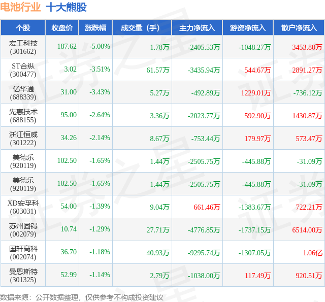 个股表现方面,电池行业当日领跌股为宏工科技(301662),该股当日报收187.62,下跌5.0%,成交量1.78万,主力资金净流出2405.53万元。ST合纵(300477)以下跌3.51%紧随其后,该股当日成交量61.57万,主力资金净流出3435.94万元。除此之外,亿华通(688339)、先惠技术(688155)、浙江恒威(301222)均进入当日熊股之列。具体个股列表见下表:
