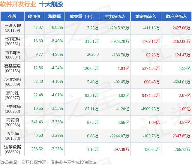 个股表现方面,软件开发行业当日领跌股为三维天地(301159),该股当日报收47.37,下跌8.85%,成交量7.25万,主力资金净流出2015.92万元。*ST汇科(300561)以下跌8.4%紧随其后,该股当日成交量31.31万,主力资金净流出5924.2万元。除此之外,*ST国华(000004)、石基信息(002153)、泛微网络(603039)均进入当日熊股之列。具体个股列表见下表: