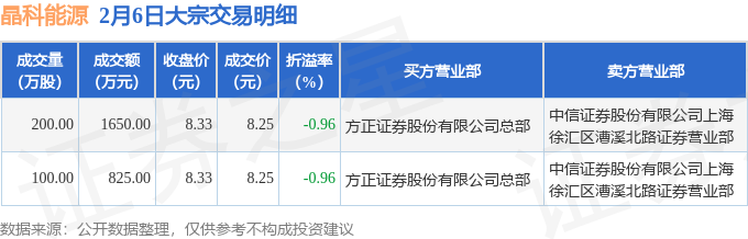 证券之星消息,2月6日晶科能源发生大宗交易,交易数据如下: