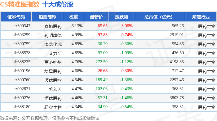 CS精准医(000863)指数十大成份股详情如下: