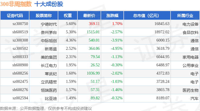 300非周(000969)指数十大成份股详情如下:
