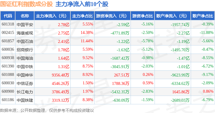 资金流向方面,国证红利(399321)指数成份股当日主力资金净流出合计16.25亿元,游资资金净流入合计8.46亿元,散户资金净流入合计7.79亿元。成份股资金流向详情见下表: