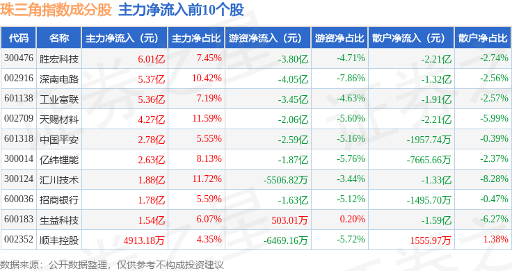 资金流向方面,珠三角(399356)指数成份股当日主力资金净流入合计19.15亿元,游资资金净流出合计17.15亿元,散户资金净流出合计2.01亿元。成份股资金流向详情见下表: