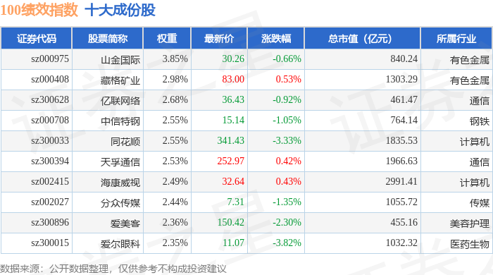 100绩效(399656)指数十大成份股详情如下: