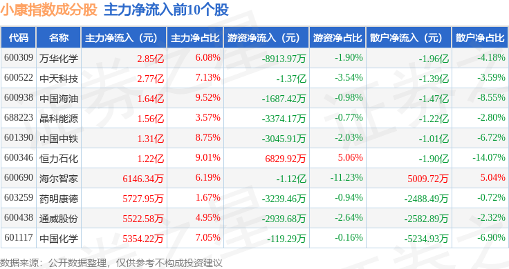资金流向方面,小康指数(399901)成份股当日主力资金净流出合计21.26亿元,游资资金净流入合计6.15亿元,散户资金净流入合计15.12亿元。成份股资金流向详情见下表: