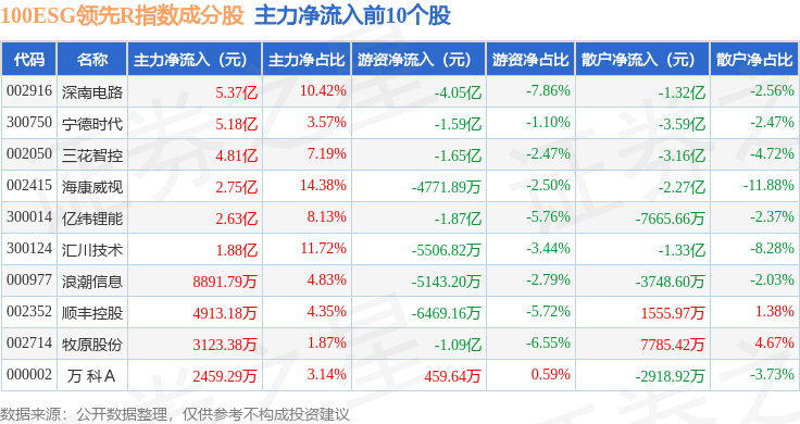 资金流向方面,100ESG领先R(470030)指数成份股当日主力资金净流出合计20.09亿元,游资资金净流入合计8.26亿元,散户资金净流入合计11.83亿元。成份股资金流向详情见下表: