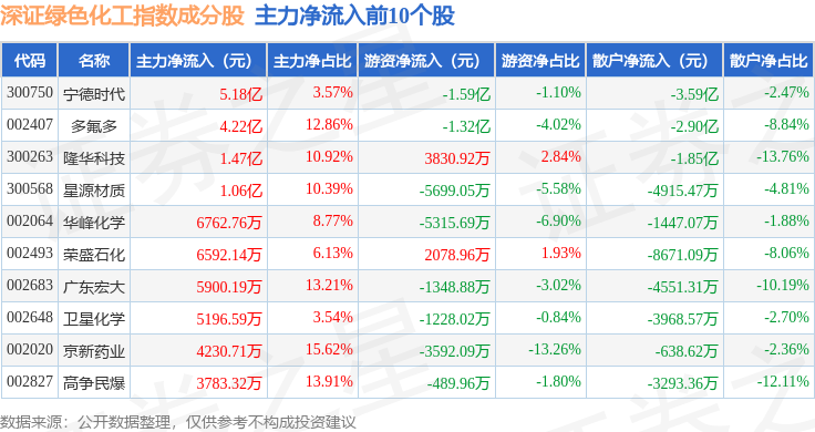 资金流向方面,深证绿色化工(970076)指数成份股当日主力资金净流入合计10.9亿元,游资资金净流出合计5.27亿元,散户资金净流出合计5.63亿元。成份股资金流向详情见下表: