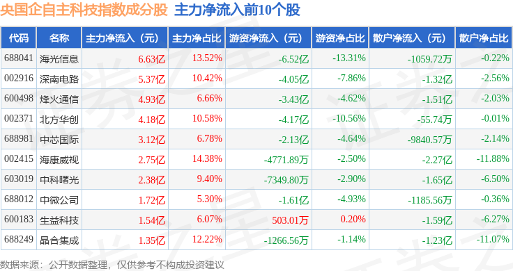 资金流向方面,央国企自主科技(980083)指数成份股当日主力资金净流入合计24.67亿元,游资资金净流出合计19.2亿元,散户资金净流出合计5.47亿元。成份股资金流向详情见下表: