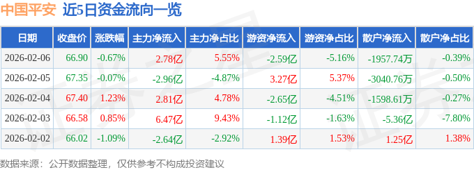 证券之星消息,截至2026年2月6日收盘,中国平安(601318)报收于66.9元,下跌0.67%,换手率0.7%,成交量74.93万手,成交额50.12亿元。