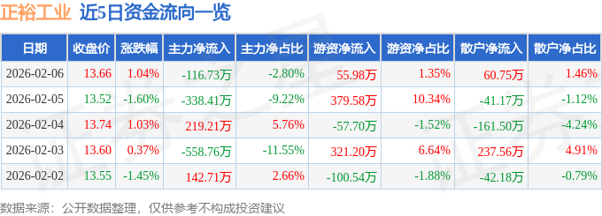 证券之星消息,截至2026年2月6日收盘,正裕工业(603089)报收于13.66元,上涨1.04%,换手率1.27%,成交量3.04万手,成交额4162.3万元。