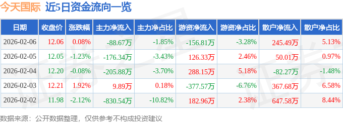 证券之星消息,截至2026年2月6日收盘,今天国际(300532)报收于12.06元,上涨0.08%,换手率0.92%,成交量3.95万手,成交额4784.53万元。