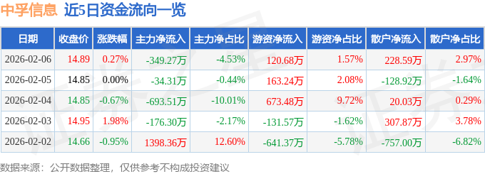 证券之星消息,截至2026年2月6日收盘,中孚信息(300659)报收于14.89元,上涨0.27%,换手率2.71%,成交量5.17万手,成交额7703.32万元。