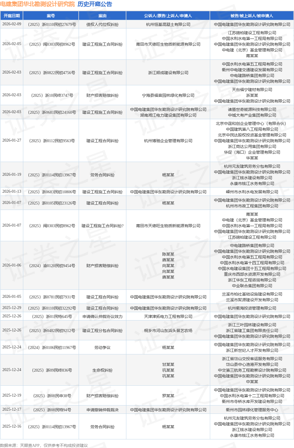 案号:(2025)浙0110民初27679号根据统计,近一年内以中国电建集团华东勘测设计研究院有限公司为当事人的历史开庭公告有110则,其中案由为“建设工程施工合同纠纷”的公告以30则居首,其次为“建设工程分包合同纠纷”有13则,“建设工程合同纠纷”有10则。历史开庭公告(前20条)如下: