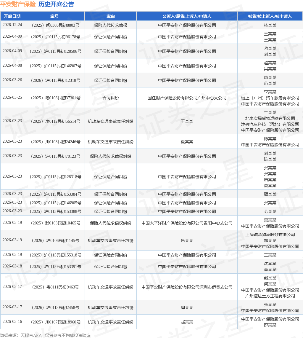 案号:(2025)渝0103民初55233号根据统计,近一年内以中国平安财产保险股份有限公司为当事人的历史开庭公告有1964则,其中案由为“机动车交通事故责任纠纷”的公告以944则居首,其次为“保证保险合同纠纷”有258则,“保险人代位求偿权纠纷”有166则。历史开庭公告(前20条)如下: