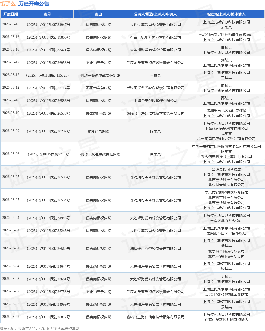 证券之星消息,根据天眼查APP显示,近日公布了一则上海拉扎斯信息科技有限公司作为被告/被上诉人的开庭公告,详细内容如下: