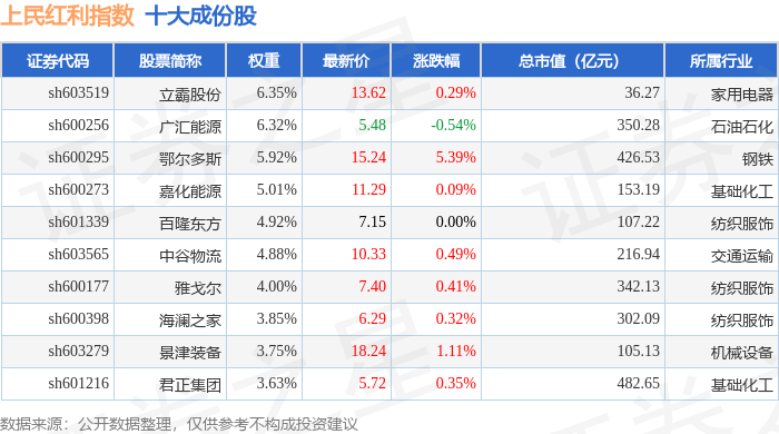 上民红利(000153)指数十大成份股详情如下: