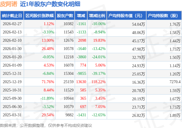 从股价来看,2026年2月13日至2026年2月27日,皮阿诺区间涨幅为1.12%,在此期间股东户数减少1161.0户,减幅为10.06%。