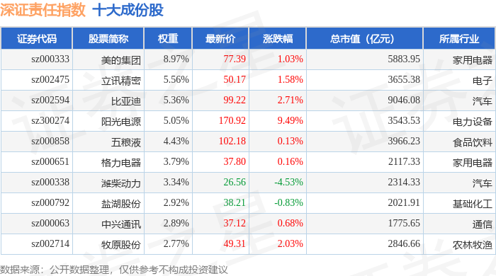 深证责任(399341)指数十大成份股详情如下: