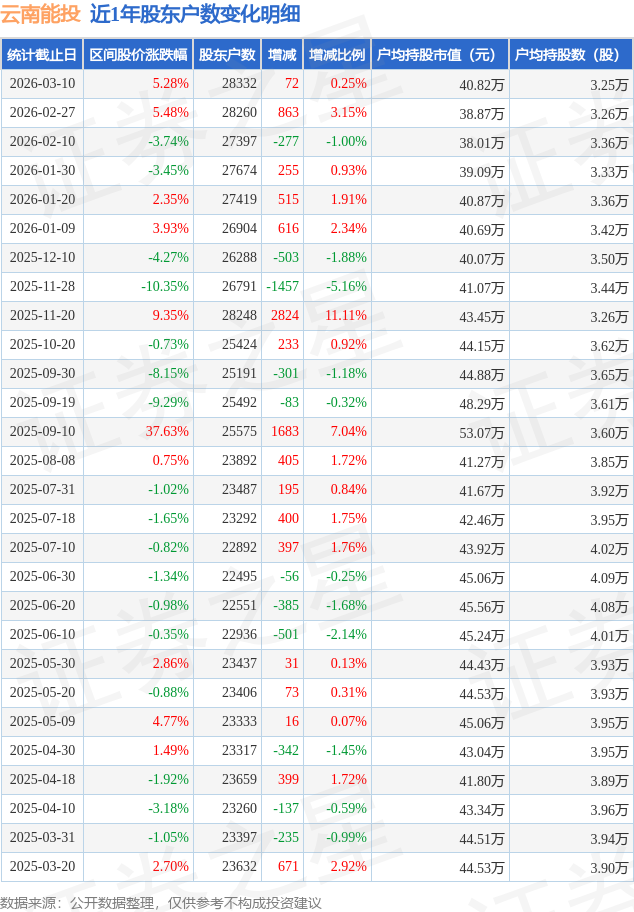 从股价来看,2026年2月27日至2026年3月10日,云南能投区间涨幅为5.28%,在此期间股东户数增加72.0户,增幅为0.25%。