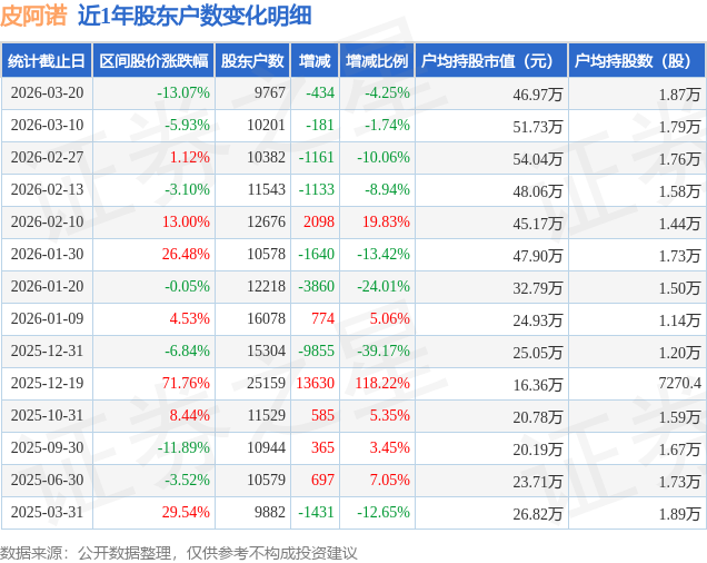 从股价来看,2026年3月10日至2026年3月20日,皮阿诺区间跌幅为13.07%,在此期间股东户数减少434.0户,减幅为4.25%。