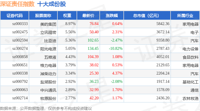 深证责任(399341)指数十大成份股详情如下: