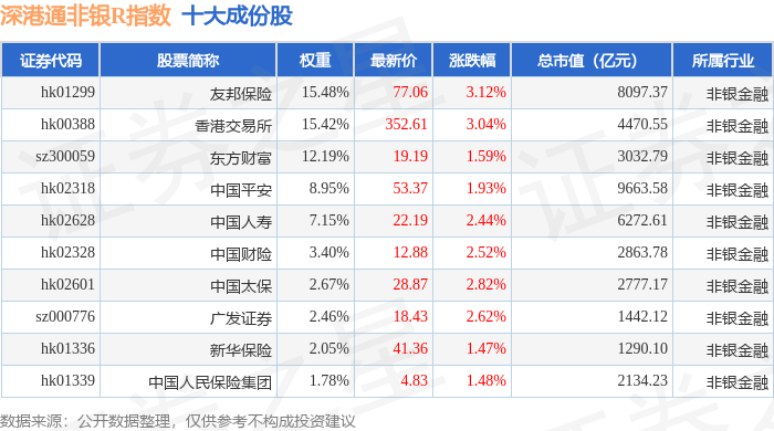 证券之星消息,4月1日,深港通非银R(483053)指数报收于8302.99点,涨1.89%,成交217.23亿元,换手率0.55%。当日该指数成份股中,上涨的有58家,富卫集团以4.21%的涨幅领涨,下跌的有1家,中油资本以3.04%的跌幅领跌。