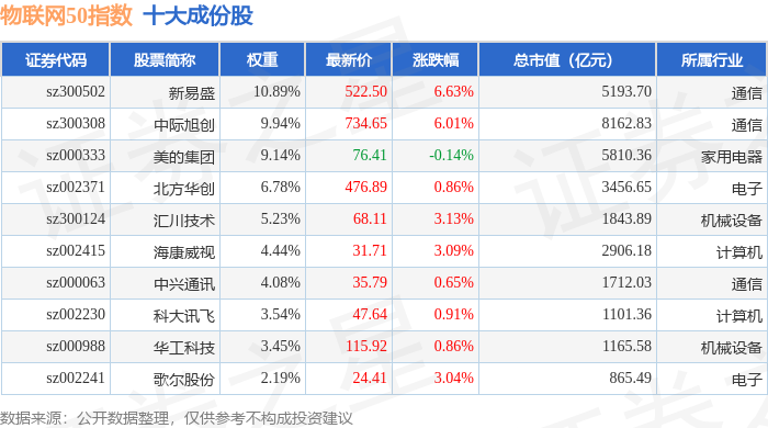 物联网50(399285)指数十大成份股详情如下: