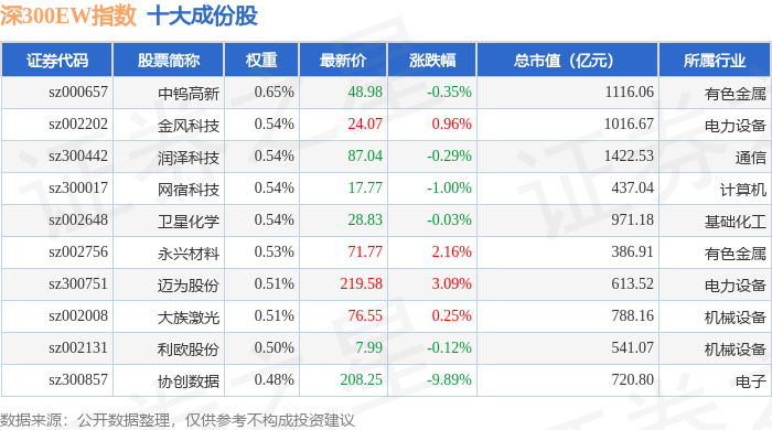 深300EW(399633)指数十大成份股详情如下: