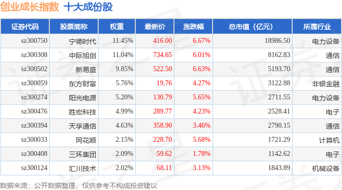 创业成长(399667)指数十大成份股详情如下: