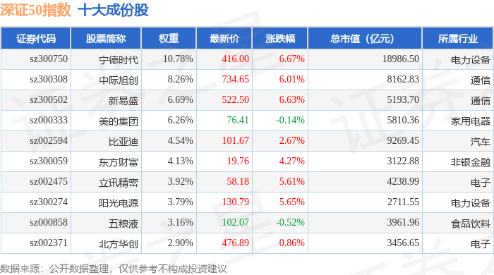 证券之星消息,4月10日,深证50(399850)指数报收于929418.0点,涨296.0%,成交2090.55亿元,换手率160.0%。当日该指数成份股中,上涨的有36家,宁德时代以6.67%的涨幅领涨,下跌的有14家,海大集团以2.6%的跌幅领跌。