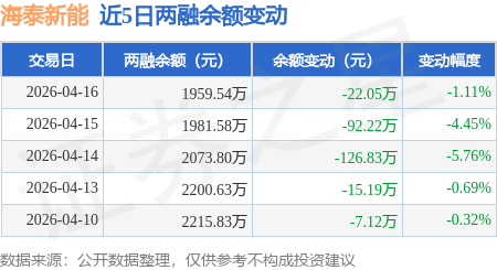 证券之星消息,4月16日,海泰新能(920985)融资买入24.45万元,融资偿还46.5万元,融资净卖出22.05万元,融资余额1959.54万元。