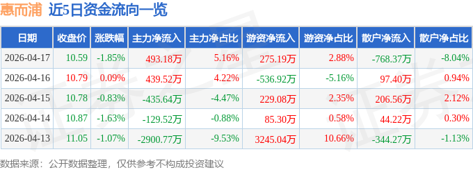证券之星消息,截至2026年4月17日收盘,惠而浦(600983)报收于10.59元,下跌1.85%,换手率1.18%,成交量9.02万手,成交额9558.34万元。