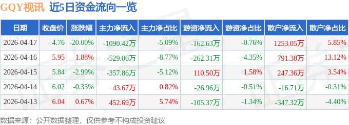 证券之星消息,截至2026年4月17日收盘,GQY视讯(300076)报收于4.76元,下跌20.0%,跌停,换手率10.43%,成交量44.23万手,成交额2.14亿元。