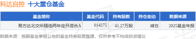 根据2025基金年报公募基金重仓股数据,重仓该股的公募基金共1家,其中持有数量最多的公募基金为易方达基金的易方达北交所精选两年定开混合A。易方达北交所精选两年定开混合A目前规模为2.49亿元,最新净值1.5862(4月16日),较上一交易日上涨1.59%,近一年上涨11.55%。该公募基金现任基金经理为邱天蓝。邱天蓝在任的基金产品包括:易方达新丝路灵活配置混合,管理时间为2024年11月19日至今,期间收益率为27.98%;